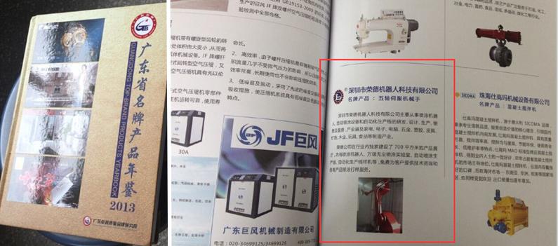 近日由廣東卓越質(zhì)量品牌研究院出版的《2013廣東省名牌產(chǎn)品年鑒》,深圳市榮德機(jī)器人科技有限公司赫然在目。