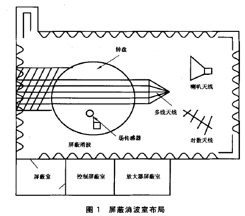 為 了 測(cè) 試操作者的安全,操作者必須被保護(hù)起來(lái)避免受到試驗(yàn)場(chǎng)所產(chǎn)生的高頻和高強(qiáng)度電磁場(chǎng)的傷害。即便是在人員稀少的鄉(xiāng)村,開(kāi)闊場(chǎng)地是可以接受的,但若受法律限制,至少需要一個(gè)屏蔽室。由 屏 蔽 室改造的,具有部分隔襯的屏蔽室,是使用一定數(shù)量的能吸收射頻(RF)的材料來(lái)抑制無(wú)隔襯屏蔽室的主諧波。假如能建立一個(gè)均勻場(chǎng),進(jìn)行的輻射抗擾性測(cè)試就可得到承認(rèn)。另 一 方 面,考慮到機(jī)器人的尺寸,在對(duì)機(jī)器人進(jìn)行輻射抗擾性測(cè)試期間,要達(dá)到一個(gè)較好的均勻場(chǎng),推薦使用屏蔽消波室。即使局部隔襯的屏蔽室沒(méi)有消波室那么寬敞。圖 1 給 出了一個(gè)適合進(jìn)行機(jī)器人 EMC測(cè)試的屏蔽消波室的布局。除消波室之外,在機(jī)器人輻射抗擾性測(cè)試期間,一些鄰近的屏蔽室通常用于放置與機(jī)器人相關(guān)的測(cè)試儀器和設(shè)備。另 外 ,使 用適當(dāng)?shù)奶炀€(即多股的傳輸線)和采用適當(dāng)?shù)臏y(cè)試設(shè)備可改善電磁場(chǎng)的均勻性。