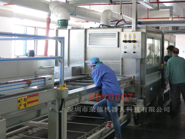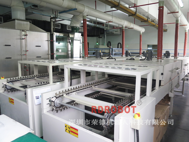工藝流程:自動(dòng)打毛→上噴膠輸送線→加熱AB膠→自動(dòng)噴膠→自動(dòng)噴砂→機(jī)械手自動(dòng)抓取到排料線→機(jī)械手自動(dòng)抓取到烘干線→烘干—冷卻—下件(非標(biāo)定制)